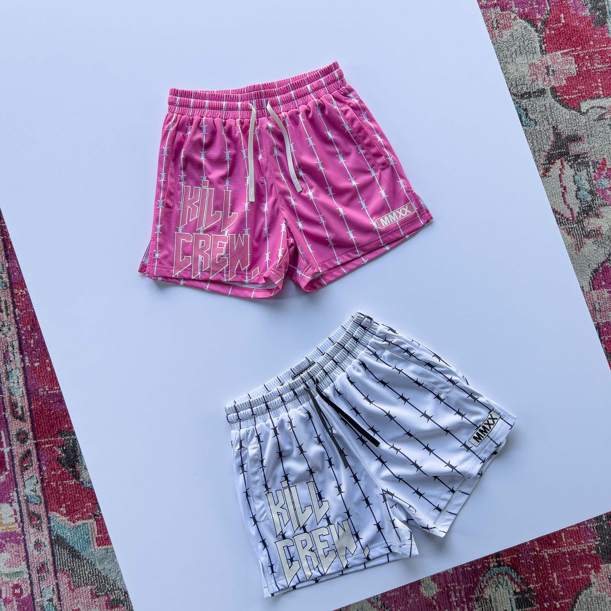 BARBWIRE MUAY THAI SHORTS (MID THIGH CUT) - WHITE / BLACK